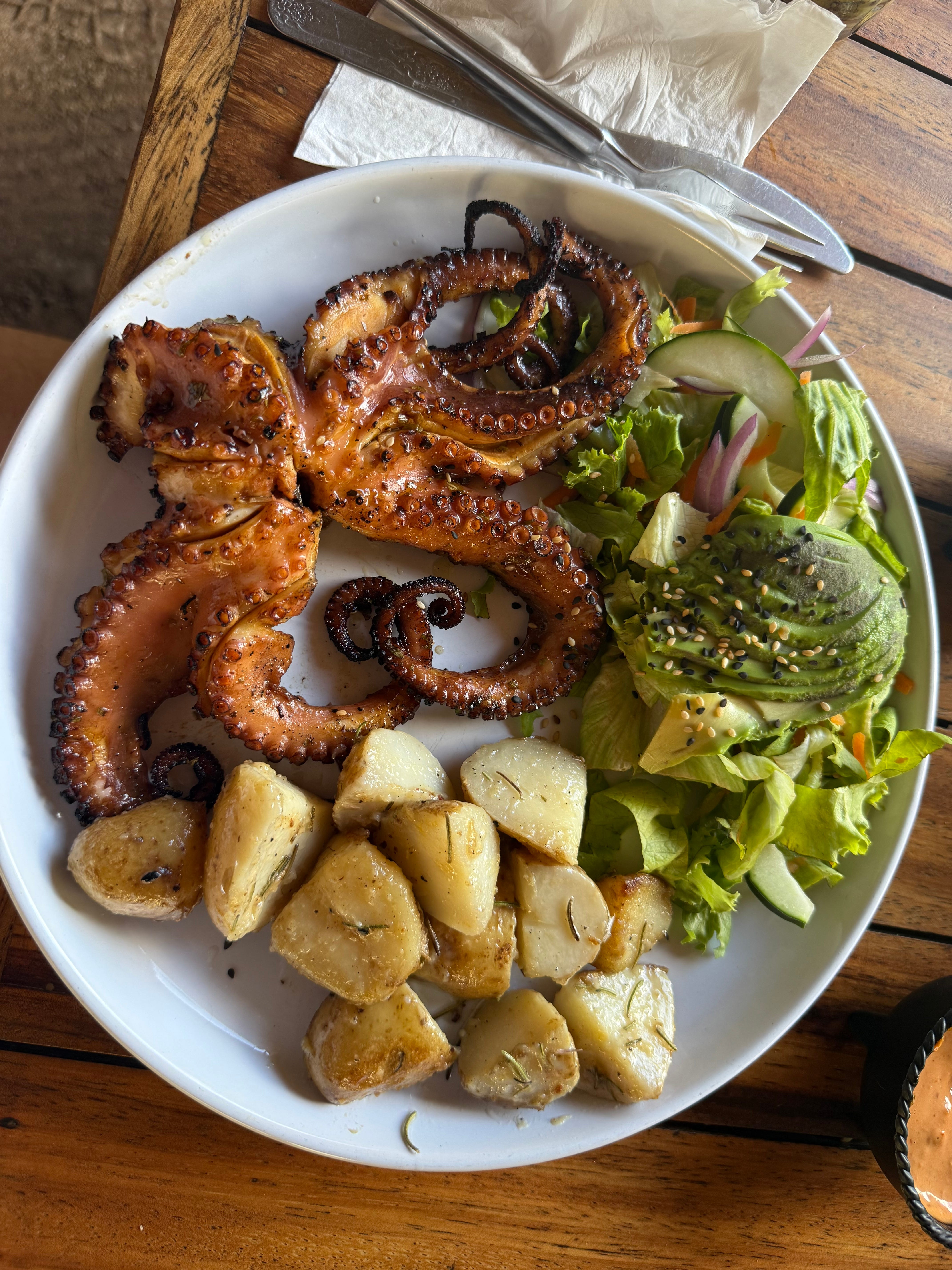 As we sat talking my head slowly started to, I don’t know, feel. I could feel it in a way that wasn’t necessarily painful but was uncomfortable. It felt heavy. My food, which I’m sure was delicious, was a struggle to eat. I had ordered grilled octopus, he had ordered grilled shrimp. I told him about the dream I’d had once where an octopus ate me. Our conversation turned to parents, family, I mentioned how my dad had died. I feel a little weird, I said, talking about my skull. He put his arm on my shoulder. Aww, he said, talking about my dad.